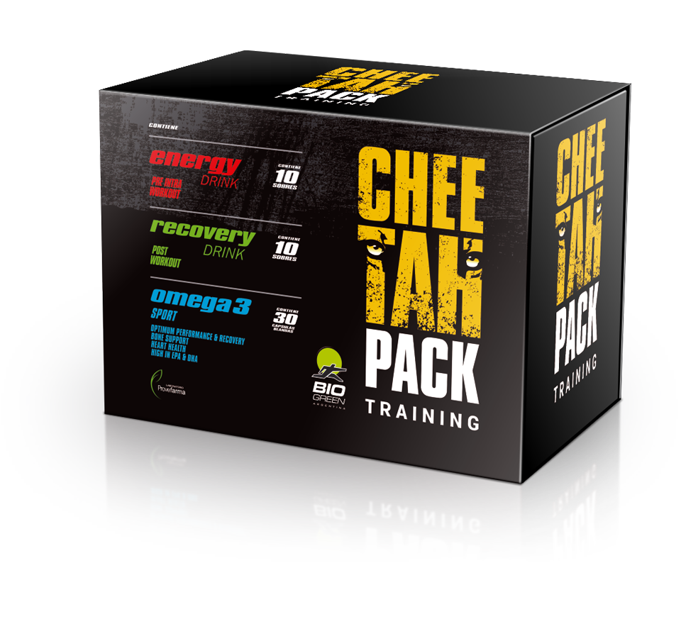 Caja de apertura tipo deslizante que contiene los 3 componentes de CHEETAH PACK en sus correspondientes envases.